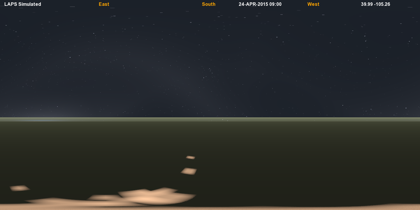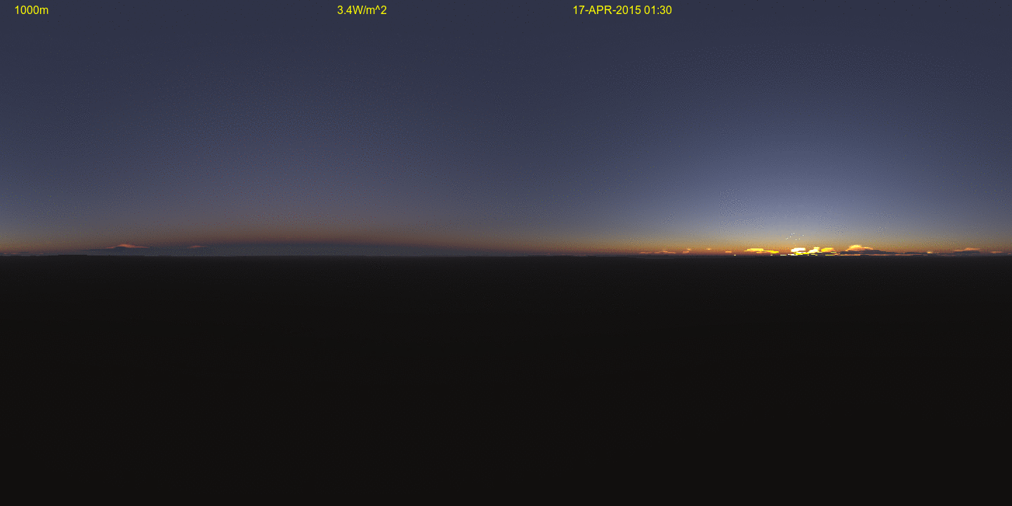 This view has twilight just beginning with the sun located 15.95 degrees below the limb. The limb itself is pushed down quite a bit below the horizontal due to the