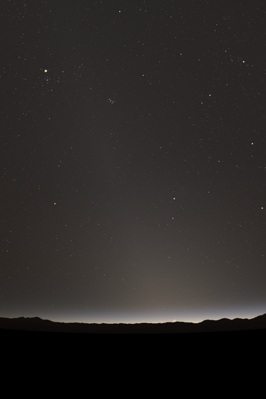 We see the twilight arch low in the west along with zodiacal light and airglow.