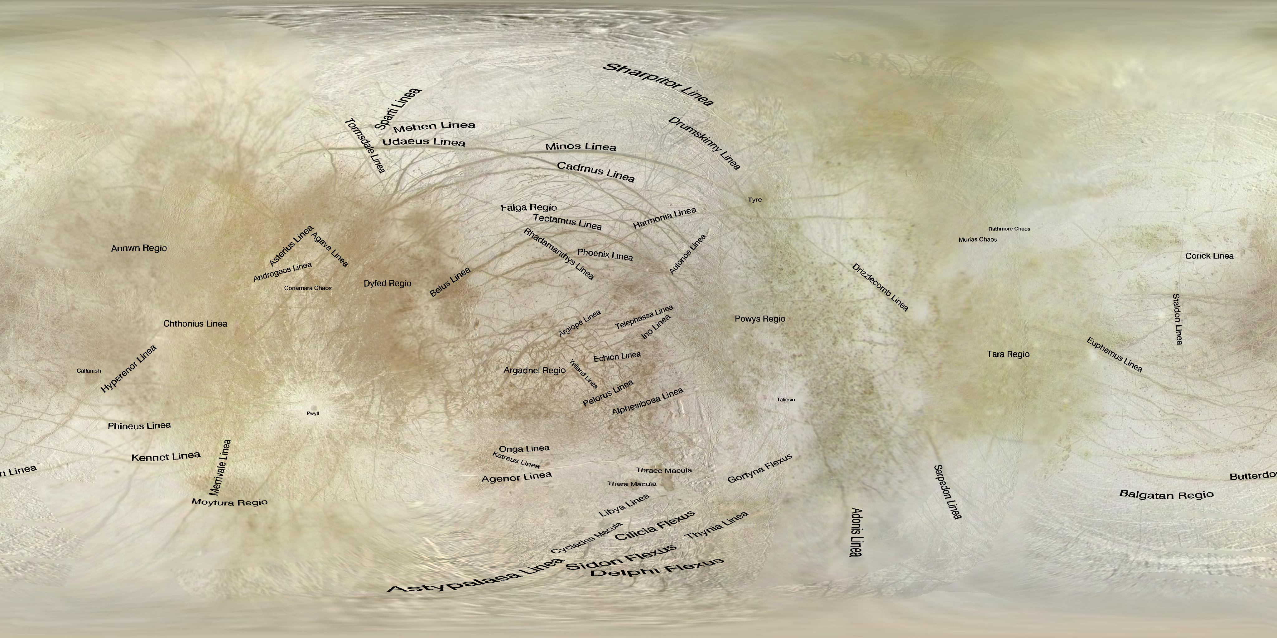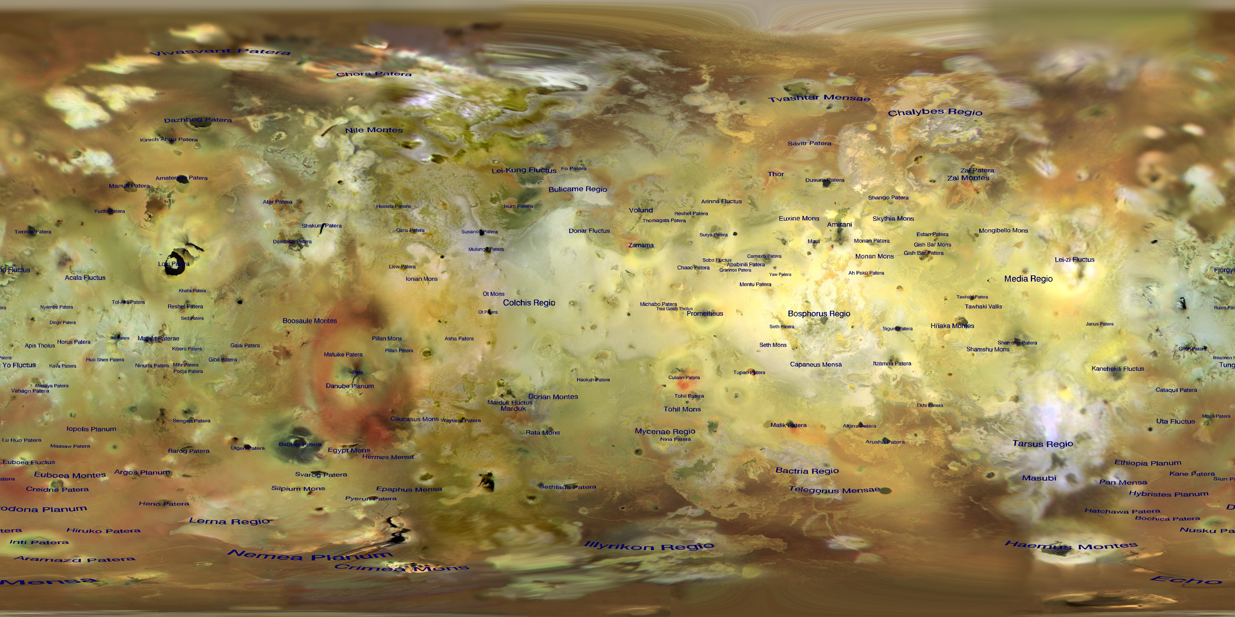 For Celestia and other users here are some versions with feature names overlain. The font is "pre-distorted" so it shows up well on a spherical projection. The nomenclature for the feature maps is from the USGS Gazeteer