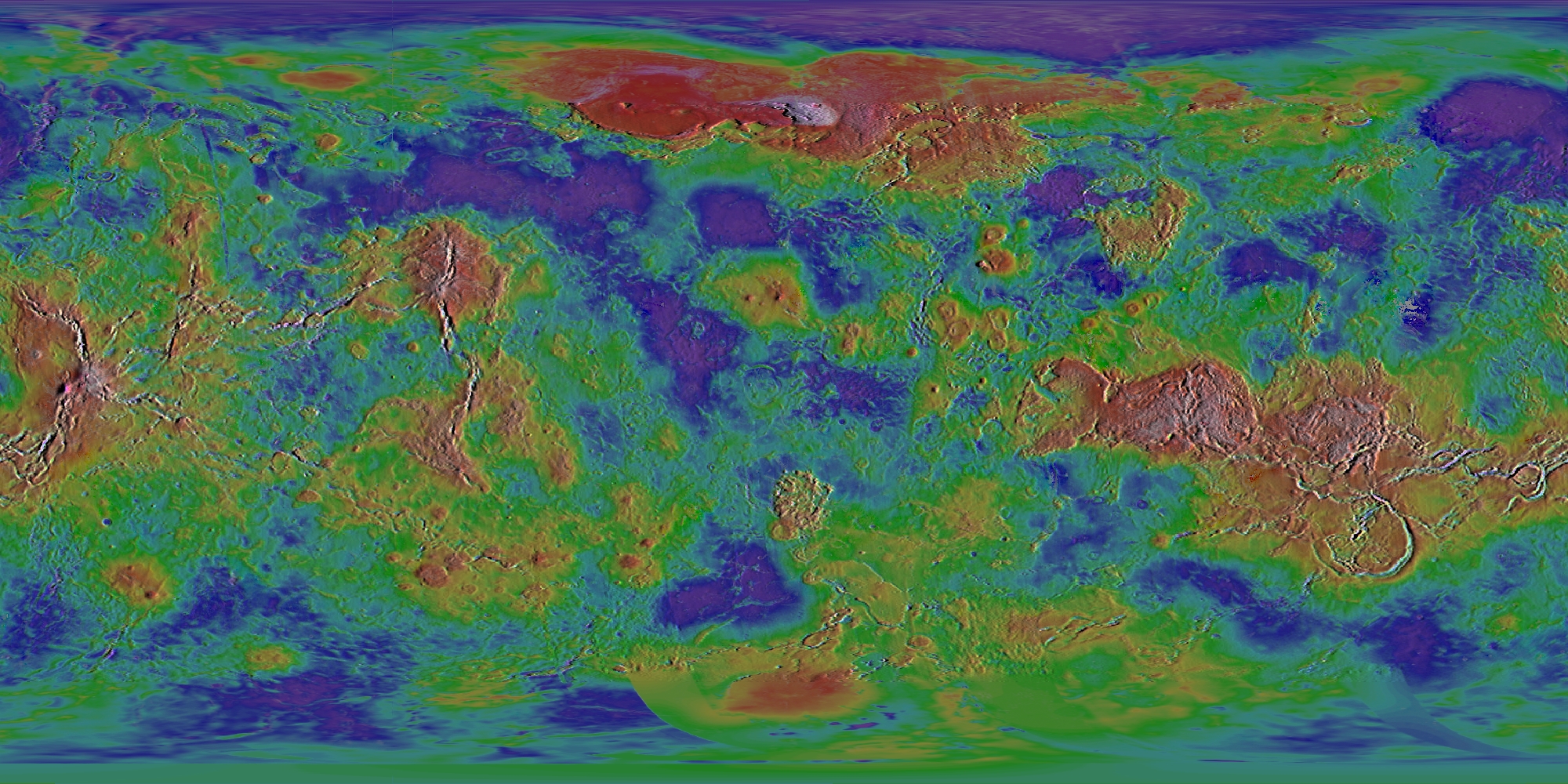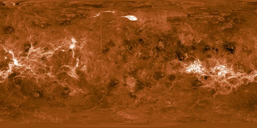 I have some other global Venus images, one of which is shown here. This is a combination of two images. The hue information comes from Calvin Hamilton's cylindrical map . The shaded-relief (intensity) information is used from A. Tayfun Oner's Venus topography map . Tayfun's black & white map was warped from a Mercator onto the Cylindrical projection shown here at a resolution of 1000x2000 pixels. Red and white colors are highest and the light source comes from the right (east) side.