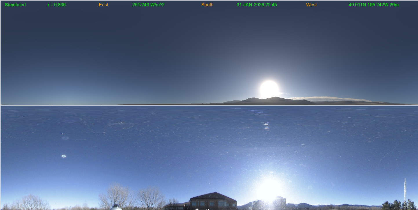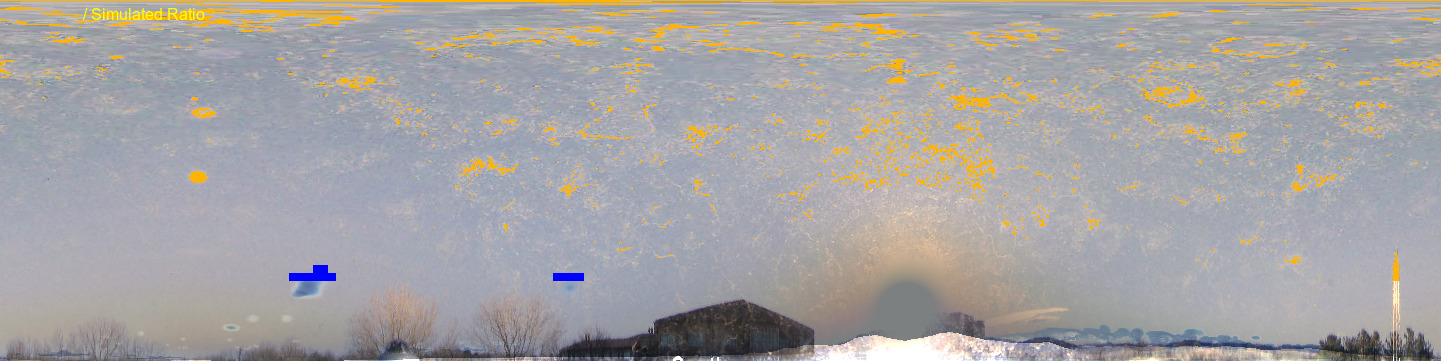In these 360 degree panoramic (all-sky) views, a simulated cloud/aerosol analysis (using satellite though no camera) image is shown (top) compared with a remapped independent camera image (second)