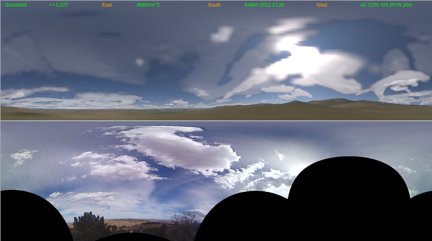 In these 360 degree panoramic (all-sky) views, a simulated cloud/aerosol analysis (using satellite though no camera) image is shown (top) compared with a remapped independent camera image (bottom)
