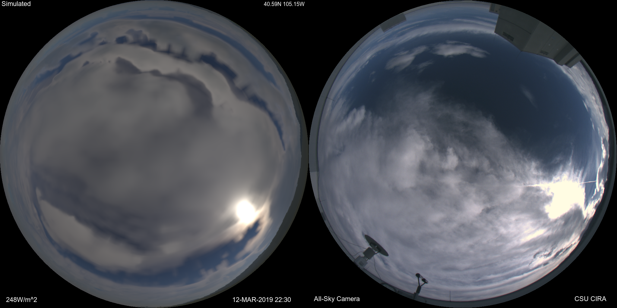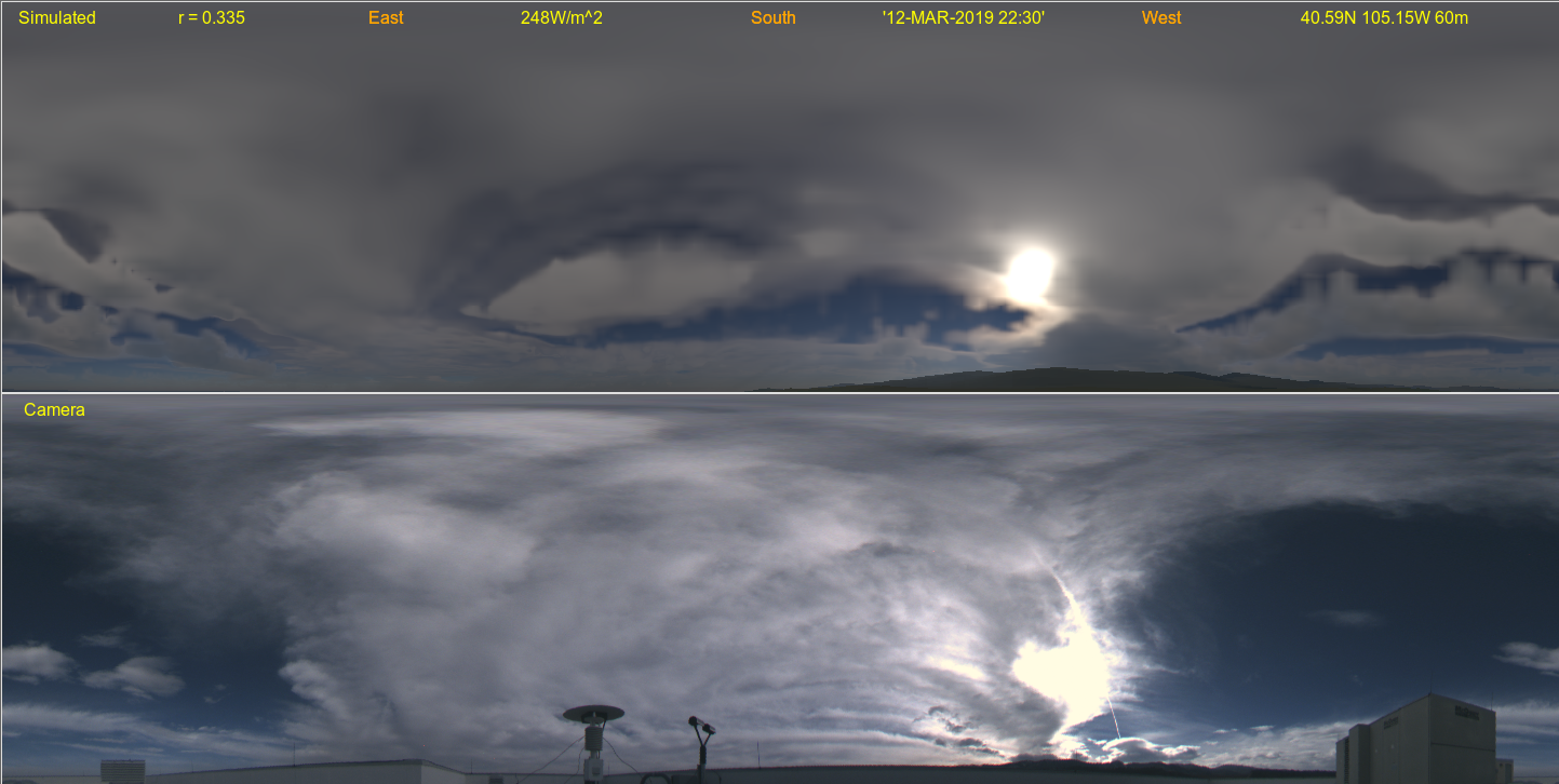 The image above on the left is simulated from an analysis of 3D hydrometeors using GOES ABI and other data. Aerosols are specified via namelist. The image on the right is from an EKO Instruments all-sky camera located at CIRA (at Colorado State University in Fort Collins) at the same time. In each fisheye lens view the zenith is in the center and north is up. The color balance of the simulated image is set to reproduce the "actual" colors/radiances when the display white point is set to closely match the sun. Thus to see a true apples to apples comparison (if for example you take your computer outside or right by a window), please set your display to a color temperature of 5780K (the sun's white color above the atmosphere). Some images are shown a bit dark to avoid saturating and losing details on the bright end. This can be compensated for by turning up your monitor brightness, thus showing a broader dynamic range.