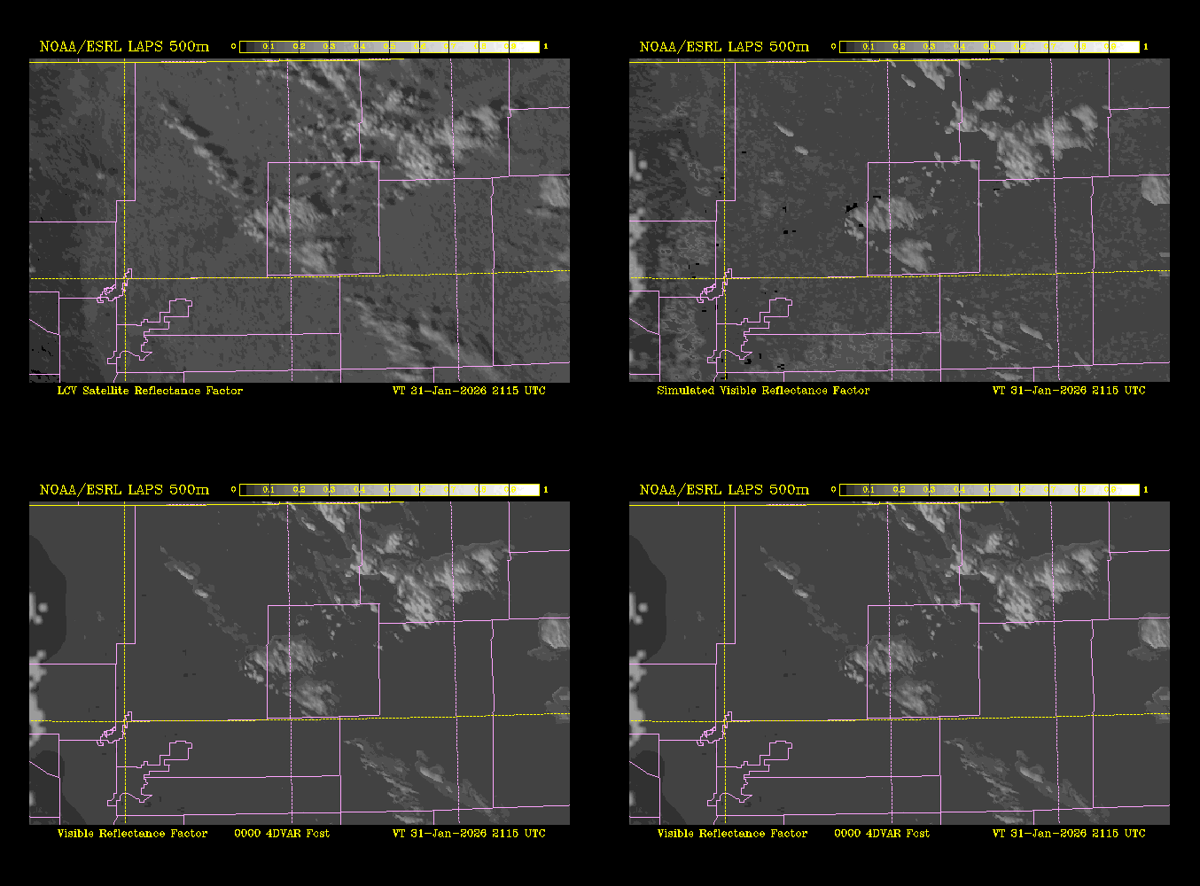 A preliminary result is shown above for a 4D-Var cloud analysis with observed visible "VIS" satellite (upper left), simulated VIS from regular