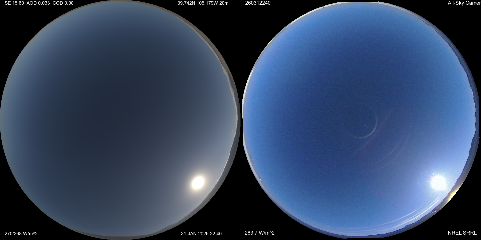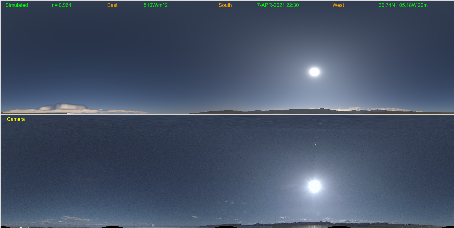 With SWIm we then simulate sky images to compare the two cloud fields. This case is from September 7, 2025 at 1735UTC. I hope to run this in real-time on a 50-100m grid.