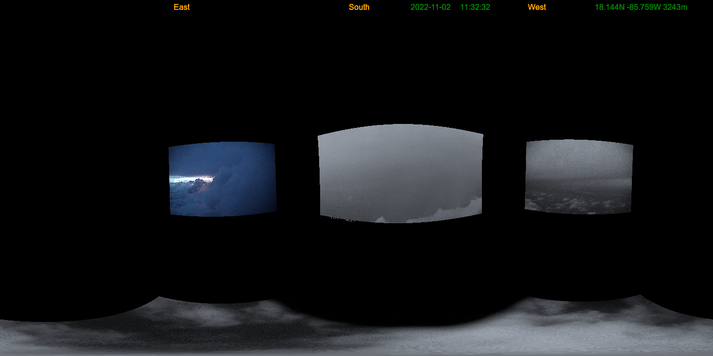 Aircraft camera mosaic video. This is an animation of about 2000 Hurricane Hunter aircraft frames of Hurricane Lisa. Each frame is a mosaic from 4 cameras projected into a 360 cylindrical projection. Here are